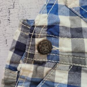 Blur and white plaid checkered pattern with Oshkosh b'gosh logo on center and back