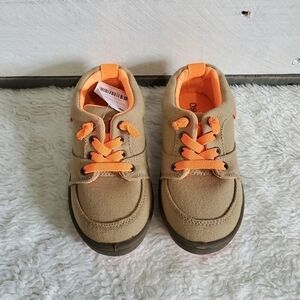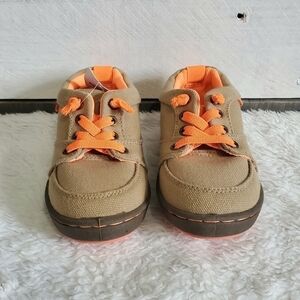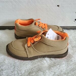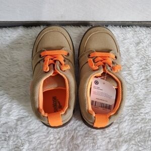 NWT Oshkosh B'Gosh Thomas canvas sneaker shoes. Size Toddler 11, khaki & orange in color, elastic orange shoe laces for easy on & off, no tieing needed. Some marking on bottom outsole as shown in pictures. Brand new with tags!