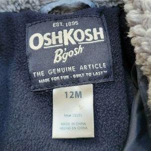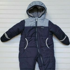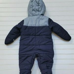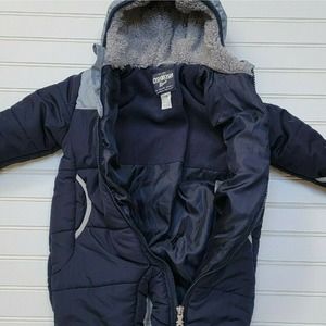 Oshkosh B'gosh One-Piece Snowsuit, size 12 months, navy and gray, soft fleece lined hood, zips up front, has pockets, the feet are detachable so can be worn either way, cuffs can be rolled down to cover hands, very good condition.