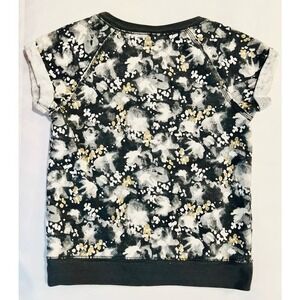 Oshkosh B’gosh mottled gray & white rolled sleeve sweatshirt - child size 6. This glammed up top has spots of gold glitter paint accents all over. The short sleeves are rolled and tacked down. It has contrasting charcoal gray banding around the neck and waistband. This shirt is in excellent used condition with no damage or stains.