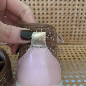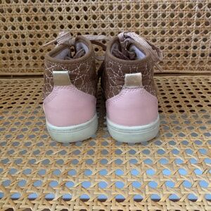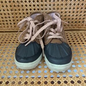 Oshkosh toddler girls Tarin winter boots in navy, brown, pink and gold. I didn't care for the big Oshkosh logo on the back, so I painted and sealed them with Angelus shoe paints. Light signs of wear throughout, but lots of life left. Size 9.