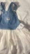 Adorable dress with blue denim top. Features adjustable straps. White eyelet skirt adds charm.