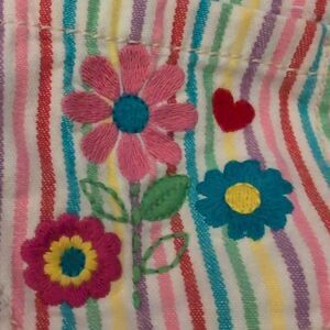 - bright colorful fun rainbow stripes and embroidered flowers on the bib