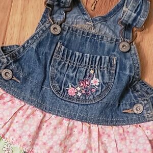Excellent used condition. Super cute overalls dress with three tiers of coordinating patterned fabric making a ruffled skirt. Embroidered flowers on the bib. Alsp comes with Peter pan collar pink onesie you see worn underneath on my daughter. Size 6 months.