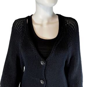 Oska Knit 3/4 Sleeve Button-up Cardigan Sweater Black. Large buttons down the front, beautiful open knit design throughout, patterned open knit design along the 3/4 sleeves. Good condition.