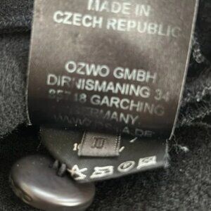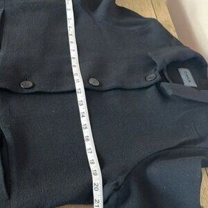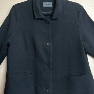 Oska stylish women’s blazer in black color, button up, has two pockets in the front. 100% Virgin Wool. No size on care label but according to measurements is a size Medium Petite. 21 inches pit to pit, 24 inches length and 20 inches long sleeve. Made in Czech Republic.