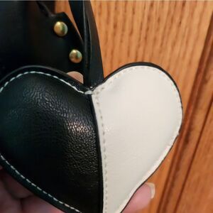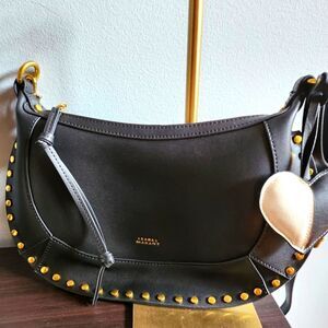Oskan Moon black sleek half moon leather crossbody with adjustable strap converts to shoulder bag. Comes with garment bag and added leather black and white heart charm.