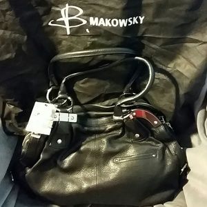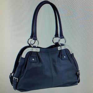 Beautiful black soft leather bag with silver tone metal frame that accents the roomy dome satchel. Strap drop is 10''. I got this as a gift but it's not my style. Would love for it to find a new home.