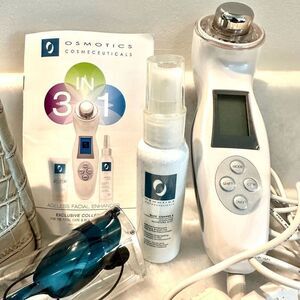 The Osmotics Cosmeceuticals 3-in-1 Ageless Facial Enhancer is an advanced skincare beauty tool designed to rejuvenate the skin and enhance facial treatments. The set includes a 3-in-1 facial enhancer unit, a pair of protective goggles, a charging cord and plug, a cooling moisture mist to soothe the skin, and a travel bag for convenience. This multifunctional device is tailored to improve skin texture, boost radiance, and support anti-aging routines, offering professional-level care in the comfort of your home.
