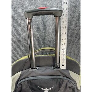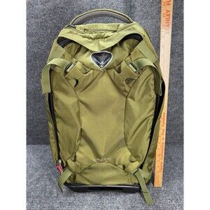 Osprey Meridian 22" 60L Wheeled Convertible Rolling Travel Backpack Carry On Bag. Features include: travel/duffle bag hybrid, padded handles, internal straps, large main compartment, top liquids pocket, high road chassis, rear panel flap, mesh zippered pocket. Overall in good condition with a clean interior and typical outer wear. Please note the wheels work fine but the pull handle sticks when trying to extend. It functions but takes a few strong pulls to get it to extend. Stowaway back straps are not included. Measurements in photos. Weighs 6.5lbs. Fast shipping!