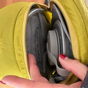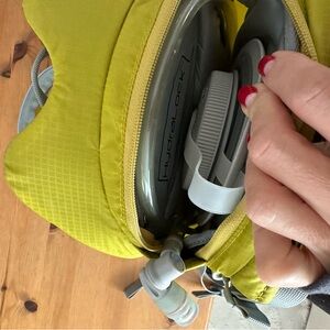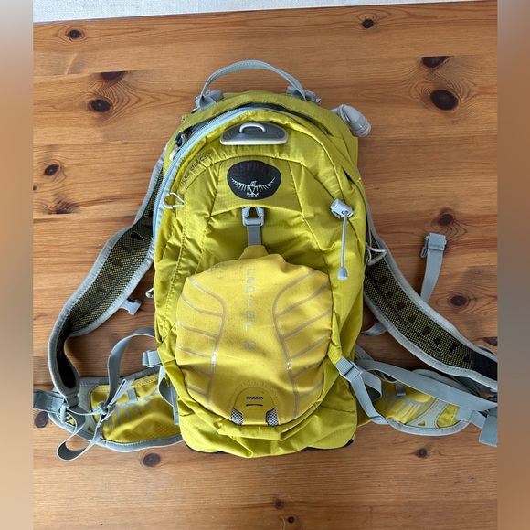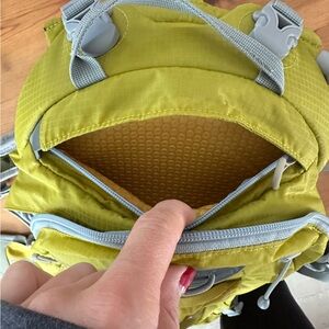 Osprey backpack in a vibrant yellow lime green color. Features multiple compartments and adjustable straps.