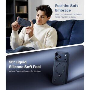 Cozy grip silicone case with 360-degree spin ring holder for iPhone 17 Pro Max. Compatible with MagSafe, offering enhanced camera protection and a comfortable, soft-touch feel.