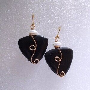 Materials: black Jasper triangles, faux pearls, golden brass jewelry wire and gold plated stainless steel earhooks.