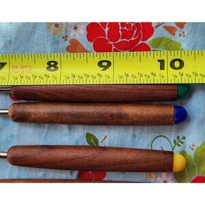 Vintage MCM, Fondue Forks Set of 4, Stainless Steel 10.25", With Round Wood Handles, Plastic Color Caps on Handle Ends, Made in Japan.