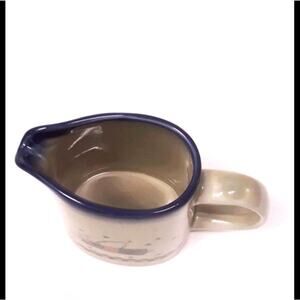 This is such a cute creamer created in the delightful folk art style of Carol Endres. It shows an angel flying and blowing a horn, with a flowing banner that says "Peace in the Country".