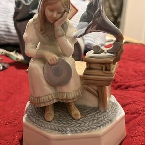 Charming porcelain figurine featuring a woman with a gramophone. Elegant design with intricate details. Perfect for collectors. plays “Those were the days”