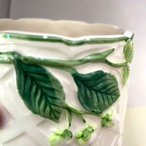 This decorative ceramic vase features an embossed blackberry and floral design. Its sturdy craftsmanship and timeless design make it a tasteful addition to home decor.