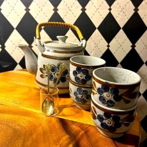 Experience the art of tea with this exquisite Otagiri Japanese tea set, featuring a hand-painted teapot and four matching cups. Known for its craftsmanship and timeless beauty, Otagiri pieces are highly collectible and celebrated for their delicate brushwork and serene, nature-inspired designs.