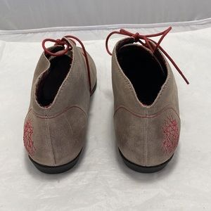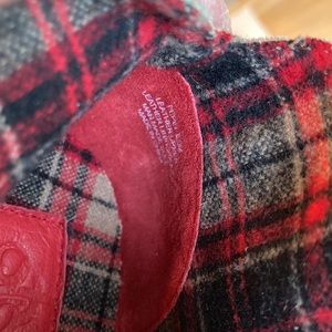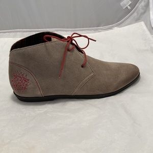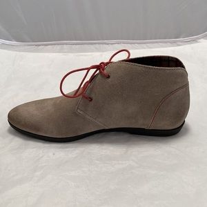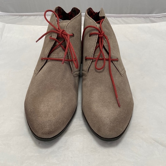 Authentic OTBT lace up suede boots. Done in a distressed taupe suede leather outer with red laces and red stitching and logo at back and side. Red plaid flannel lining. Rubberized sole and heel. Lightweight and very comfortable. NWOT. Never worn. Includes original box. Size 8 1/2, Medium width.