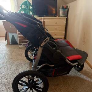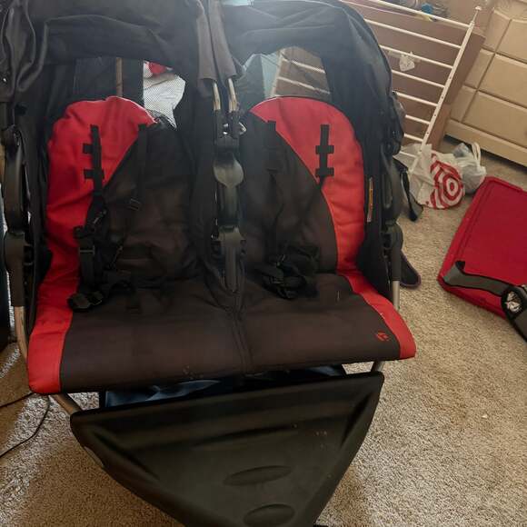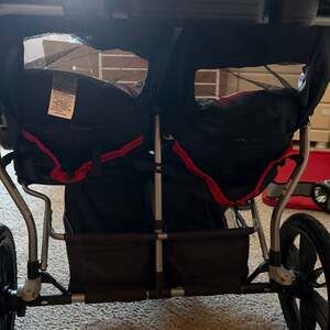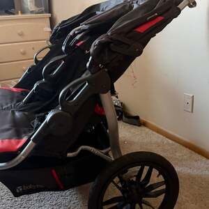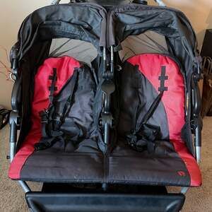 Baby Trend Expedition Double Jogger Stroller, Black/Red — Side-by-side seating with large bicycle tires for all-terrain mobility.