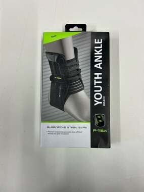 P-TEX Youth Ankle Brace with Supportive Stabilizers. This high-performance ankle support features thermal compression to promote efficient muscle and joint movement. Designed specifically for young athletes, it includes adjustable straps for a secure and customized fit. Ideal for sports recovery or injury prevention. Brand new in original packaging.