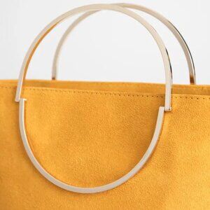 Suede bucket bag with metal handles and a shoulder strap. Strap drop length: 57cm / 22.4". Bag width (top): 25cm / 9.8" Bag width (bottom): 14cm / 5.5". Bag length: 21cm / 8.3". Metal handle dimensions: 5cm x 8cm2" x 3".