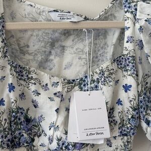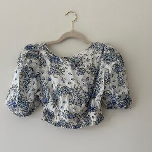 Elegant crop top with floral design. Features puff sleeves. Perfect for a chic look. 100% linen