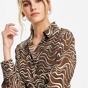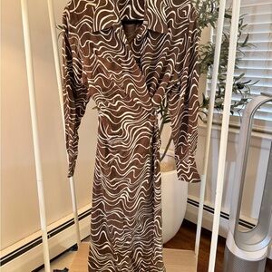 Stylish dress with a brown and white swirl pattern. Features a wrap design and long sleeves.