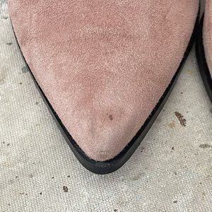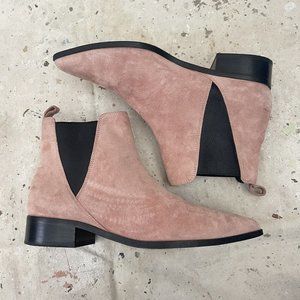 Super pretty and femme with an edge. Pink suede pointed to Chelsea boots with black detailing.