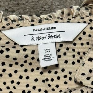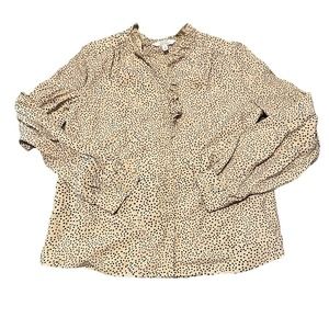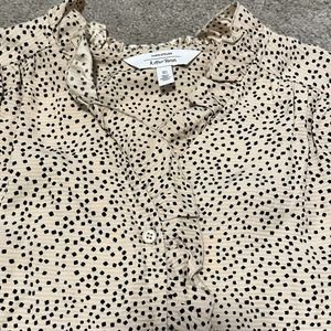Chic cream blouse with black polka dots. Features ruffled neckline and cuffs. Perfect for casual or office wear.