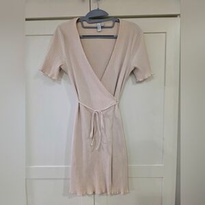 Fitted v-cut mini wrap dress in a ribbed finish with short sleeves, frilled cuffs and hem, and a self-tie detail at the side.