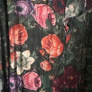 Chic long sleeve dress with dark floral pattern. Features ruffled details and a flowing silhouette.