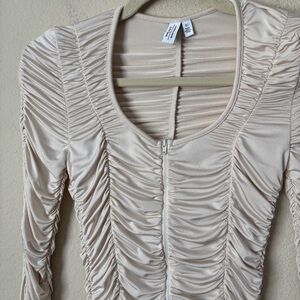 Elevate your style with this chic cream ruched long sleeve top. Perfect for any occasion, this top offers a flattering fit and elegant design.