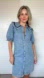 Buttoned mini denim dress detailed with a frilled, stitched Peter Pan collar and frilled cuffs.