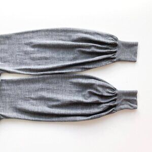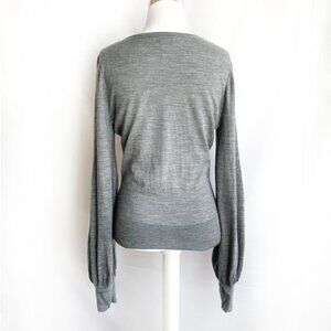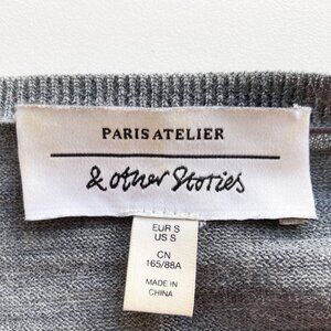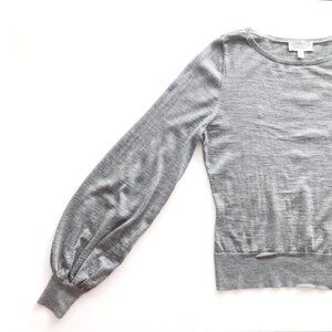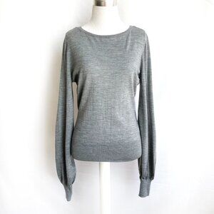 Soft and lightweight, this 100% wool pullover from & Other Stories has a rounded neck and long sleeves with some ballooning near the cuff. Banded waist and cuffs. Light silver gray color.