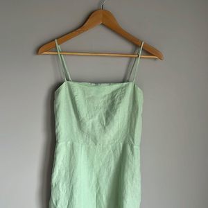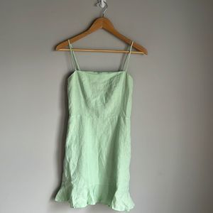 Chic mini dress with a ruffled hem. Spaghetti straps and square neckline. Perfect for summer outings.