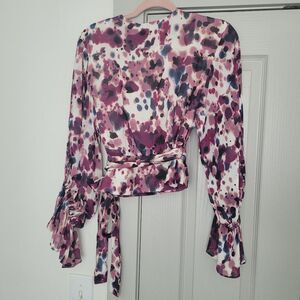 Stylish floral wrap top with vibrant colors. Perfect for any occasion.
