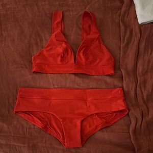 Vibrant red bikini set from & Other Stories. Features a stylish top and matching bottoms. Perfect for a bold beach look.