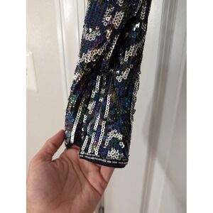 Dazzling sequins catch the light in this & Other Stories Rodarte wrap top, a statement piece that exudes glamour and sophistication. The intricate sequin embellishments create a mesmerizing pattern, adding depth and texture to the design. A flattering wrap silhouette cinches at the waist with a tie closure, accentuating your figure and creating a customized fit. Long sleeves provide coverage while maintaining a sleek and elegant look. A deep V-neckline adds a touch of allure, making it perfect for evening events or special occasions. Note the missing sequins on the tie.
