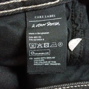 Black with contrasting stitching. High waist. Tapered straight leg. Stretch.