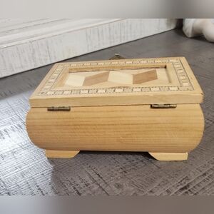 Elegant wooden jewelry box. Features geometric pattern. Secure metal clasp. Perfect for organizing jewelry.
