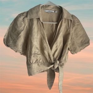Beauitful no longer sold cropped beige wrap top with princess sleeves. Features collar. Very smal unnoticeable mark on the top, pictured in last slide.
