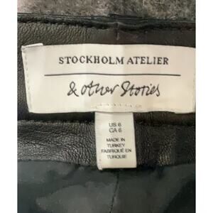 These black leather Wide Leg Cropped pants from & Other Stories in size 6 are a stylish addition to any woman's wardrobe. The flared leg style and ankle length add a trendy touch to the classic black leather material, making them versatile for both casual and dressier occasions. Perfect for a chic and modern look, these pants are a must-have for any fashion-forward individual looking to add a statement piece to their collection.