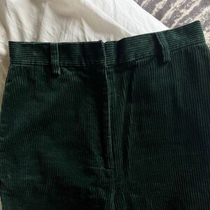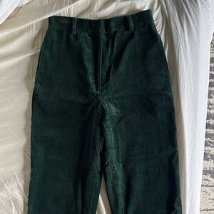 Wide wale corduroy pants in great condition in a very rich dark green shade. Very soft and comfortable. Waist is 13.25" across measured flat, inseam about 25", high rise, or can be worn slouchy as I did.