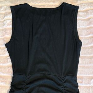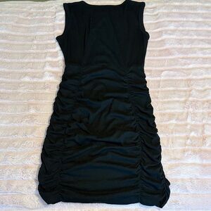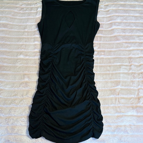 Sleeveless mini with center keyhole neckline. Side ruching creates a gathered silhouette. Smooth knit fabric for a sleek look. Versatile for day or evening.