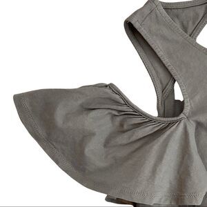 Cold Shoulder Relaxed Fit Short Ruffled Sleeve Top in soft olive green has open back with gathering to add to the flowing bodice. Tapered bottom.