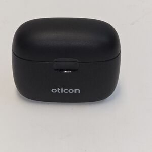 Oticon hearing aids with charging case and accessories. Includes instruction manuals and batteries. Sleek black design.