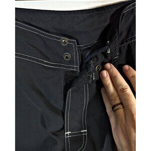 Pure nylon for durability. Elastic waistline with hidden drawstring and hook and loop closure fits waist sizes from 34 to 40 inches comfortably. 11-inch inseam with leg slits for range of motion.