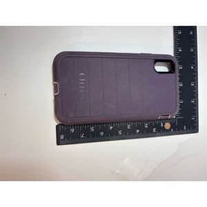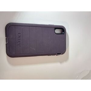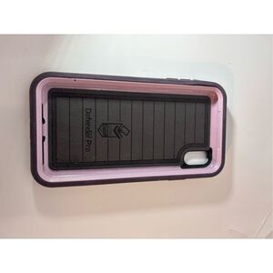 OtterBox Defender Pro case in purple with light pink accents. Designed for iPhone X or iPhone XS (5.8” screen). Multi-layer protection with built-in screen cover and port covers. Outer shell has a ribbed texture. No cracks or major damage. Fits phone approximately 5.65 inches tall.