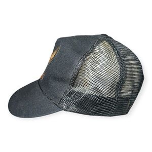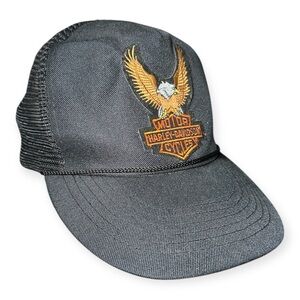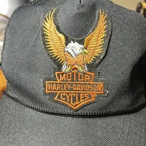 Black hat with Harley-Davidson emblem. Features eagle design in orange and white.